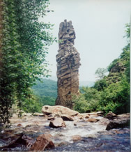 仙人塔,塔高48米,寬9米,厚5米,它突兀聳起,雄渾偉岸,穿云刺霧,傲視蒼穹,猶如南天玉柱,又似定海神針,更象一位凜凜仙人。塔下,斜瀑急流,似冰飛玉濺,一靜一動,剛柔相濟,各具特色,相得益彰,別具韻味。